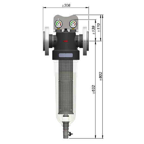- Einfache und bequeme Entleerung (Ablasskugelhahn am Boden des Gehäuses).