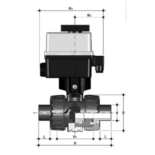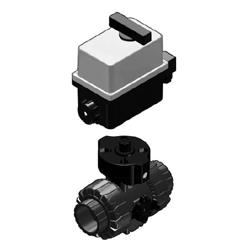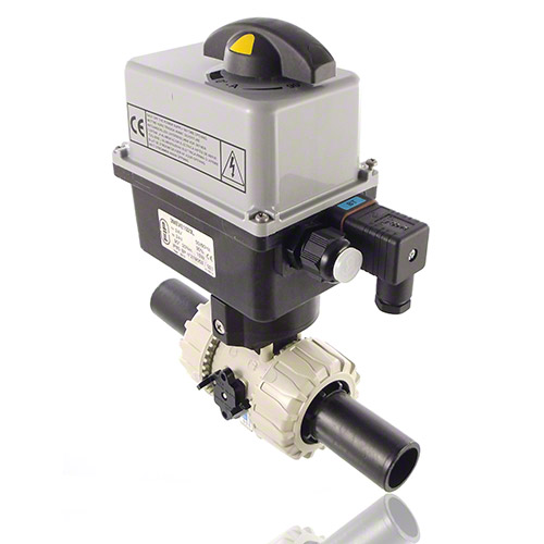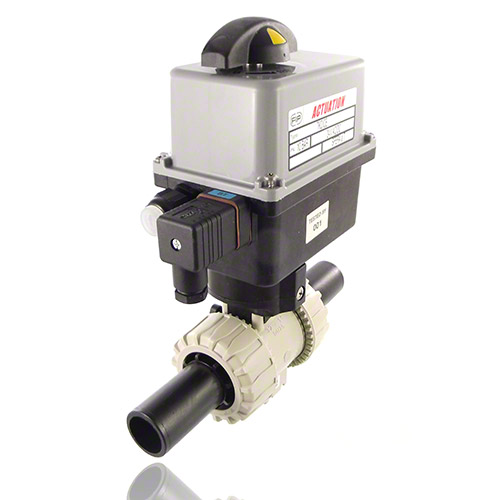 2/2-Wege-Kugelhahn mit gesicherten Überwurfmuttern aus PP mit elektrischem Stellantrieb