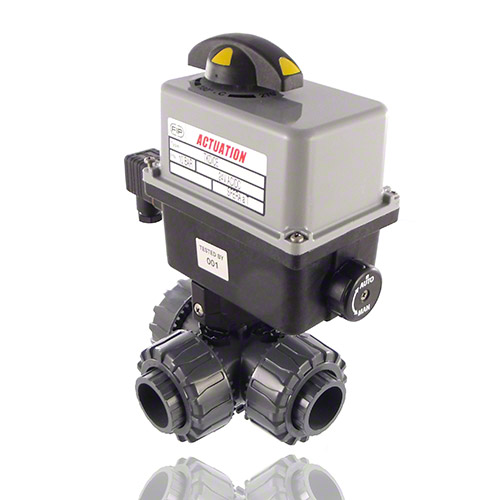 | 3-Wege-Kugelhahn aus PVC-U mit elektrischem Stellantrieb mit Endlagenrückmeldern, Handnotbetätigung und optischer Stellungsanzeige Kugel mit T-Bohrung Standardkugelstellung: 1 Stellantriebsdaten: Standard 90-240V / 50-60Hz (AC) ohne Aufpreis 24V AC/DC Andere Spannungen auf Anfrage ***DN50 = PN16 auf Anfrage Anschluss: Klebemuffe Dichtung: PTFE/EPDM |