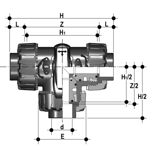 | -Bohrung: T-Bohrung -Anschluss: Klebestutzen -radial ein- und ausbaubar -mit gesicherter Überwurfmutter -Dichtung: PTFE/EPDM -mit allseitigen Festflanschen aus PVC-U auf Anfrage |