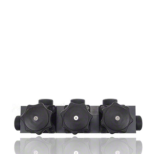 Mehrwegeventil aus ABS mit drei Handantrieben, Abgang reduziert, Membrane EPDM