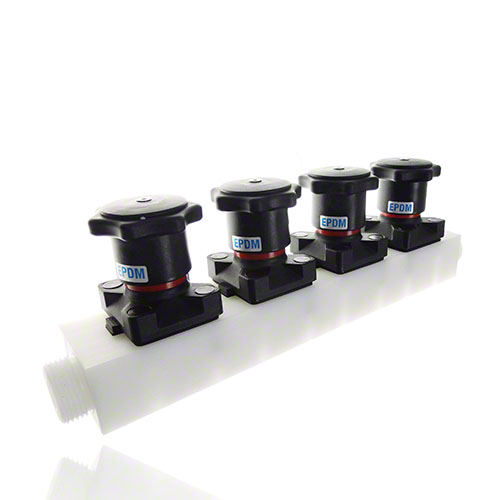 Mehrwegeventil aus PVDF mit vier Handantrieben, Abgang reduziert, Membrane FPM